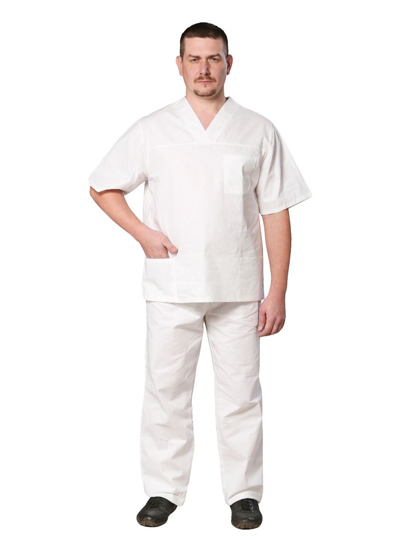 Рубашка с V-образной горловиной, обработанная отделочной обтачкой. Передняя часть с отрезной кокеткой, с одним верхним и двумя нижними накладными карманами. Нижние карманы входят в боковые швы. Рукава втачные одношовные, короткие.