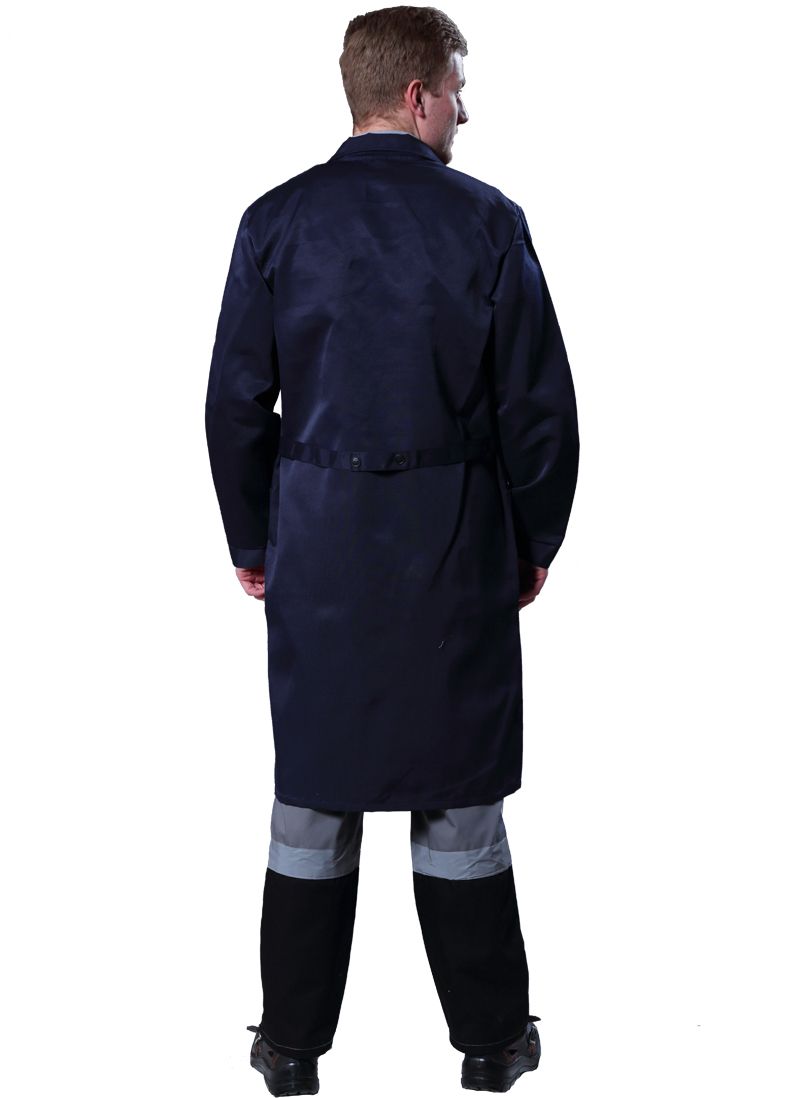 Халат с центральной бортовой застежкой на петли и пуговицы. Воротник отложной. Полочки с одним нагрудным и двумя нижними накладными карманами. Нижние карманы входят в боковые швы. Спинка со средним швом, с хлястиком, втаченым в боковые швы. Рукава с манжетами, застегивающимися на пуговицы.