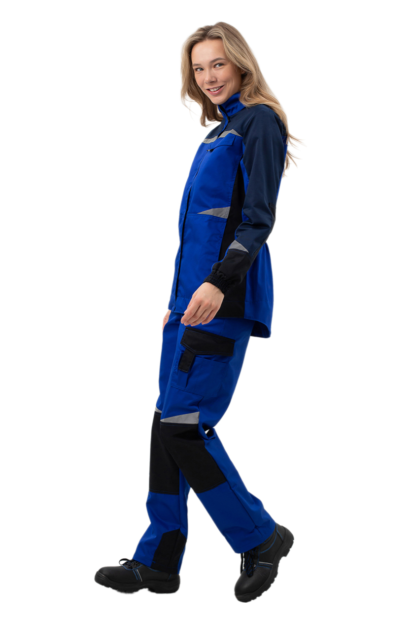 ➠ Брюки с застежкой на молнию, с притачным поясом, стянутым резинкой в области боковых швов для лучшей посадки на фигуре, пояс со шлёвками. Застежка пояса на пуговицу. Брюки с боковыми карманами с наклонной линией входа, с наколенниками и усилениями по шаговому шву. На задней половинке брюк фигурный накладной карман. На боковом шве брюк расположен накладной многофункциональный карман с фигурным клапаном и застежкой на липучку. Костюм со светоотражающими фигурными полосами для лучшей видимости в темное время суток.