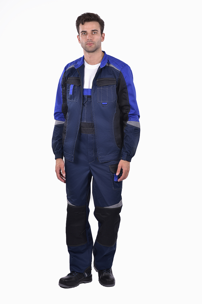 ➠ Полукомбинезон: застежка в правом боковом шве на пуговицу, в среднем шве — на «молнию». Карман с клапаном на грудке, боковые карманы с отрезным бочком. Один карман над левым наколенником. Колени усилены накладками, заложены по 2 вытачки.