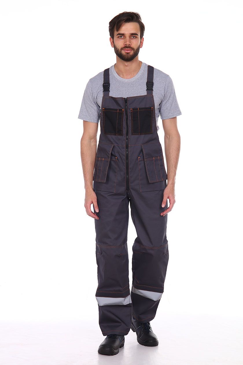 ➠ Полукомбинезон с центральной застежкой на молнию, на передних половинках накладные карманы, навесные карманы-портфели, усиления в области коленей с карманом для амортизационных прокладок. Многофункциональный боковой карман.